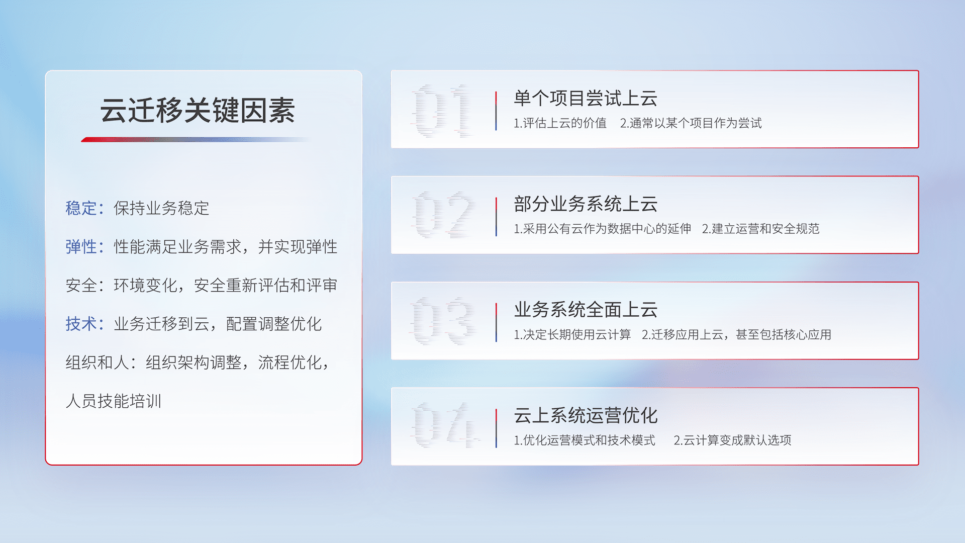 结合实际业务,,,,从规划设计、、云平台选型、、、云原生改造、、、数据迁移、、、、集成交付,,迁移全过程为客户识别最佳上云路径,,,,做好风险识别管理,,,,设计网络架构、、、身份权限、、、安全审计合规、、、、操作审计、、、日志审计、、、监控告警策略、、、多站点容灾设计等,,,,对云上基础设施进行整体规划,,,提升IT治理水平,,,,以满足弹性、、高可用、、、高性能的需求。。。