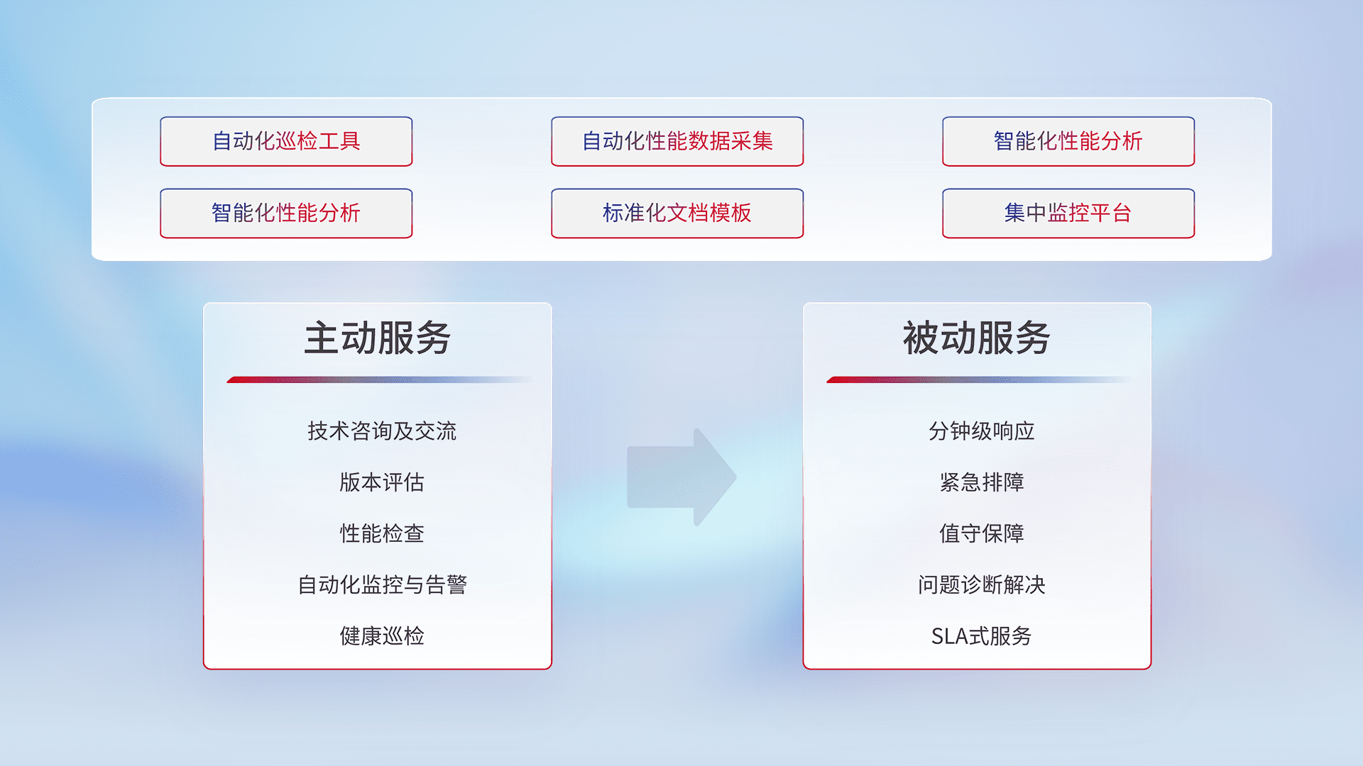智能化工具和标准化文档,,保障服务质量,,,提供主动服务(包含技术咨询、、、、版本评估、、、、性能检查、、、自动化监控与告警、、、健康巡检)和被动服务包含(分钟级响应、、紧急排障、、值守保障、、、、问题诊断解决、、、SLA服务)。。。。