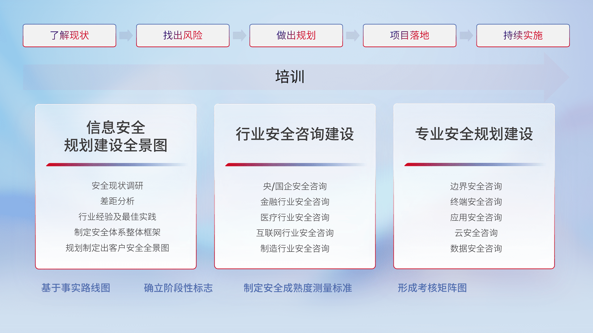 针对客户行业特性,,以专业的安全服务+多厂商联合解决方案提供专属的一站式安全管理服务,,,帮助客户全面感知网络空间威胁,,,,基于识别、、检测、、分析、、、、防护、、、、监测、、响应的服务理论模型,,,,从方案咨询、、集成交付、、评估验证、、、优化加固、、、、运维运营,,,,致力于为客户提供完整的闭环管理式安全服务。。以实战经验为客户打造高抵御风险的安全体系,,帮助客户发现威胁、、、、对抗威胁、、处置威胁,,,,不断积累安全对抗能力,,,,持续保障数字化安全。。